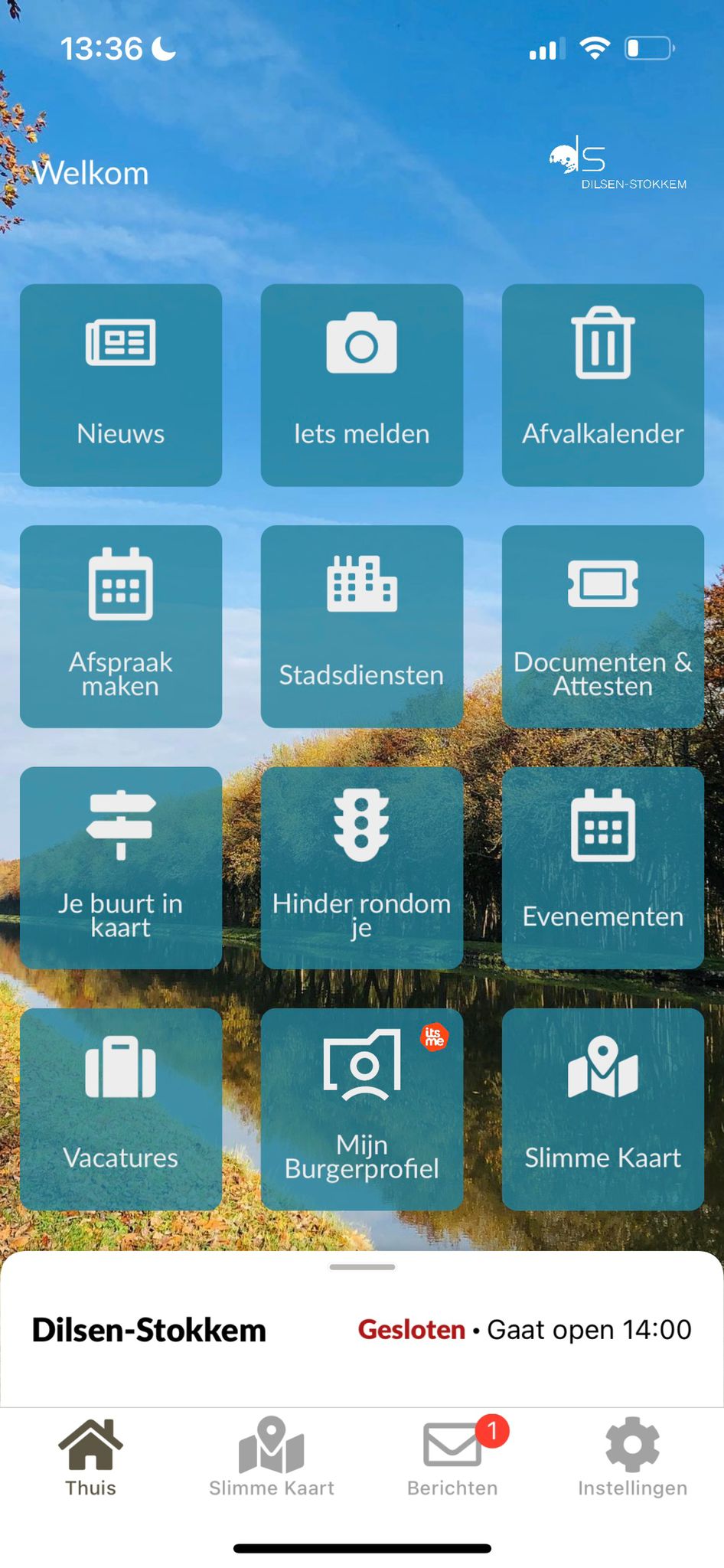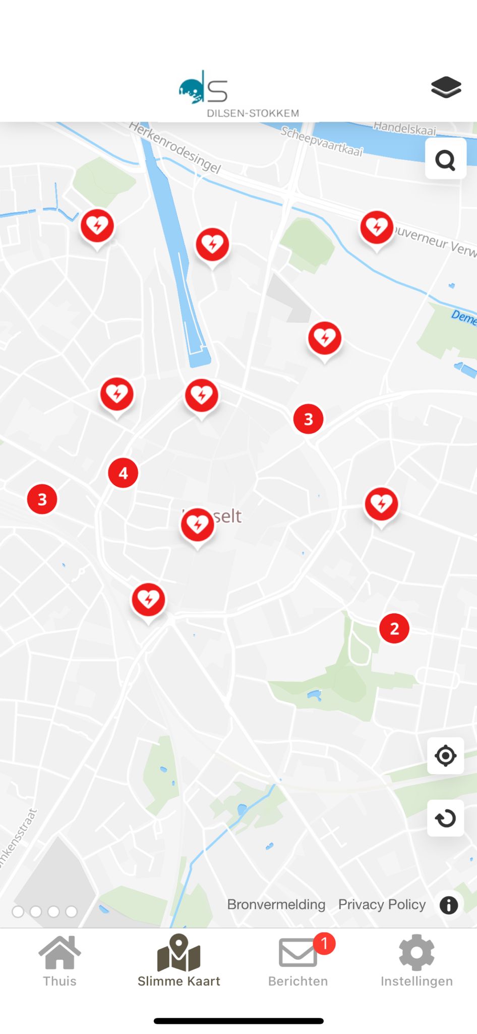 Hier ziet u een voorbeeld van het startscherm dat de gebruikers zien in Onze Stad App van Dilsen-Stokkem.