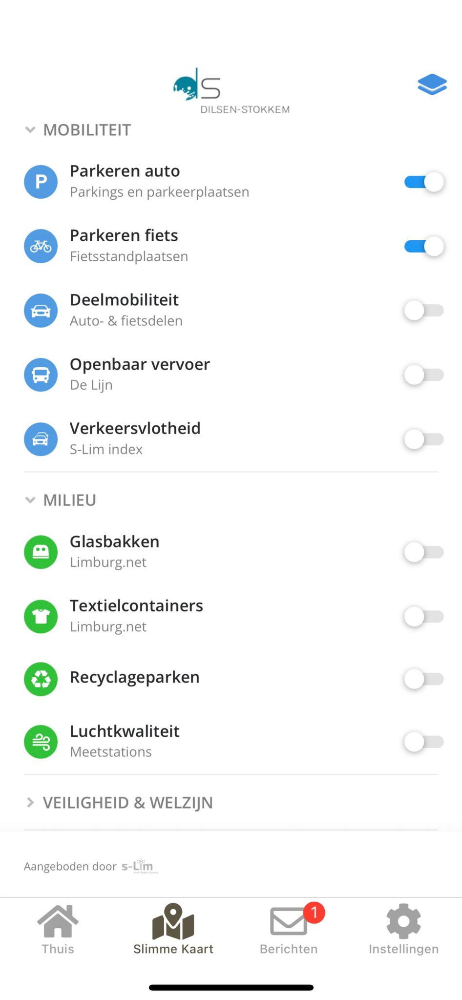 Op De Slimme Kaart duidt de gebruiker aan welke informatie hij of zij wil zien. De eerste categorie is Mobiliteit. Je vindt er alle informatie binnen één app om vlot van a naar b te geraken.