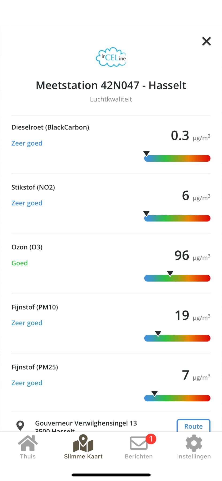 De gemeente kan ervoor kiezen om de luchtkwaliteit op de kaart weer te geven. De meetpunten staan aangeduid op de kaart en je kan erop tikken voor meer detail. Welke stoffen in de lucht hangen en hoe sterk de eventuele vervuilingsgraad is, je kan het allemaal aflezen dankzij een overzichtelijke kleurcode.